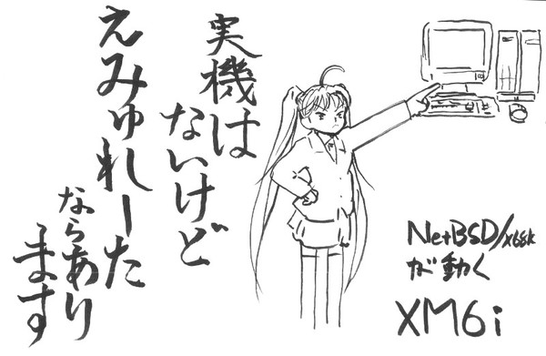 自分のノートパソコンにはX680x0エミュレータのXM6iが入れてあり、そこでNetBSD/x68kを動かすというのもよくやるんだけど、NetBSDを起動させておくだけだと画面が地味でx68kっぽさが無く埋もれてしまいます。もっとそれっぽいデモでもすればいいのに、と言う話もあるんですが、まぁ最低限説明は必要だよね、と言う感じでやっぱりその場で落描き。落描きに品質(?)は求めず。説明になってないのは言わない方向で。